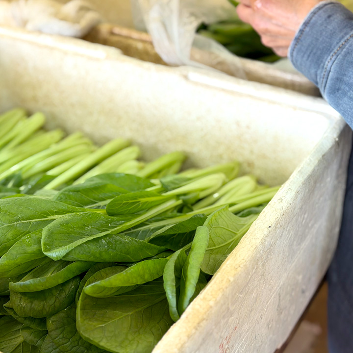 収穫は、利用者の皆さんが出社前に、事前にスタッフが行い、朝礼後すぐに、野菜の加工(根切り、計量等)ができる様に準備しています。