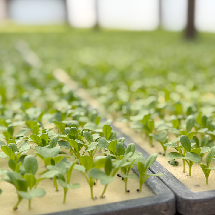 天理農場では、水耕栽培による野菜の生産から出荷まで取り組んでいます。播種(種まき)、定植、追肥、収穫をはじめ、計量、袋詰め、シーラー、梱包など、さまざまな作業を通して、日々の仕事を行っています。